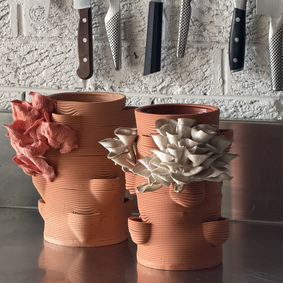 It’s reimagined as a considered, sculptural object in the home - lending dignity to the mushrooms. Mycelia House is designed for oyster mushroom varieties that side fruit, with top-fruiting varieties coming soon.